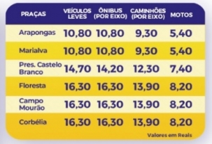 Para caminhões o preço por eixo passou para R$ 13,90 nas praças de Campo Mourão (BR-369) e Floresta (PR-317).