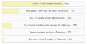 Se depender dos leitores de Boca Santa os pequenos municípios estão ferrados. Pelo menos daqueles que votaram na enquete: 65% cravaram a opção a favor do projeto de extinção de cidades com menos de 5 mil habitantes. E outros 11% ainda foram na opção de acabar até com quem tem população maior. Somente 18% votaram a favor dos pequenos municípios. O resultado completo está no quadro acima.