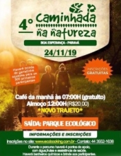 Acontece no próximo domingo a 4ª Caminhada Internacional na Natureza de Boa Esperança. É o circuito Rio Barreiro, com 12 km entre trilhas e estradas rurais. A saída será no Parque Ecológico, mas o trajeto é diferente este ano. Outra novidade: café da manhã de graça. Pago só o almoço (R$ 20). Os primeiros 300 participantes ganharão brinde (garrafinha squeeze). A promoção é da Emater e da prefeitura.