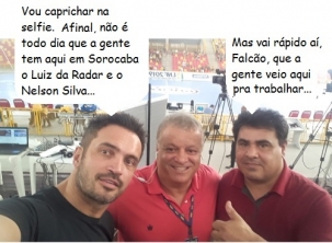 Sim, quem está fazendo a selfie é o ex-jogador de futsal Falcão, o "Pelé da modalidade". Foi em Sorocaba/SP, no recente confronto com Campo Mourão pela Liga Nacional de Futsal. Luiz Carlos da Radar e Nelson Silva estavam lá para a transmissão pela Musical FM. Aguenta os dois agora, aguenta...