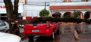 A ventania da tarde desta segunda-feira fez estragos no centro de Campo Mourão. Na av. Capitão Índio Bandeira teve galho de árvore que caiu sobre carro no canteiro central.