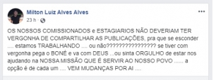 O prefeito de Campina da Lagoa, Milton Luiz Alves, chamou a atenção de parte de usa equipe no Facebook.