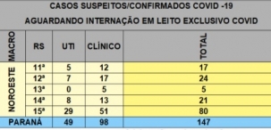 Mesmo com a habilitação de novos leitos na ala covid da Santa Casa de Campo Mourão, a fila por vagas continua. Às 10h desta segunda-feira, 17 aguardavam por vagas na área da 11.a Regional de Saúde. Cinco esperavam por UTI e 12 por enfermaria. Em toda a Macronoroeste são 147 na fila - 49 por unidade de terapia intensiva e 98 por enfermaria.