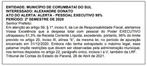 A publicação do Tribunal de Contas do Estado foi publicada nesta segunda-feira. Diz que a prefeitura encerrou 2020 comprometendo acima de 51,3% da receita corrente líquida com a folha de pagamento. OU seja: não estourou o limite da Lei de Responsabilidade Fiscal, mas já "impõe restrições que devem ser observadas pela administração municipal".