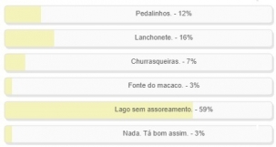 "O Parque do Lago fez 50 anos. O que deveria voltar ao local?" Enquete encerrada neste domingo não teve nem graça. A alternativa "Lago sem assoreamento" venceu com 59% dos votos. A "lanchonete" ficou em segundo, com 16%, e os "pedalinhos" em terceiro, com 12%. Para 3% "está bom assim" e não precisa voltar nada. O resultado completo está no quadro acima.