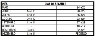 A Câmara de Campo Mourão atualizou o calendário de sessões ordinárias. A prinicipal novidade é que não haverá recesso de meio de ano, não. Foram confirmadas reuniões para os dias 26 e 27 de julho, Normalmente na segunda quinze de julho é "folga". Em compensação, como já estava previsto, não haverá reuniões na primeira quinzena de outubro, já que as datas que haveria reuniões tem feriado (12 de outubro, dia de Nossa Senhora Aparecida).