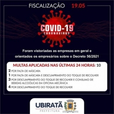 Depois dos boletins com dados da covid e da vacinação, a prefeitura Ubiratã agora publica nas redes sociais o balanço da fiscalização das medidas de combate ao coronavírus. Nesta quarta-feira, por exemplo, foram 10 multas, seja por falta de máscara, por descumprir toque de recolher ou descumprimento da lei seca.