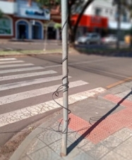 Na esquina da av. Manoel Mendes de Camargo com a rua Francisco Albuquerque, a placa de trânsito ganhou outra função: porta-fio. É mais um fio daqueles que caem dos postes de Campo Mourão. E ficam caídos...