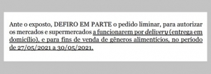 A liminar também autoriza os mercados a funcionarem pelo sistema delivery.
