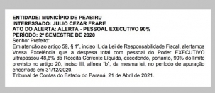 O município encerrou o segundo semestre do ano passado comprometendo acima de 48,6% da receita corrente líquida com a folha de pagamento. É o que diz alerta publicado nesta segunda-feira pelo Tribunal de Contas do Estado. Apesar do limite da Lei de Responsabilidade Fiscal ser 54%, o TC entende que já é preciso ficar de olho na situação.
