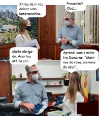 Em tempo: Na foto, Maia mostra a Naiany os modelos de tênis e sandálias que a prefeitura fornece aos alunos da rede municipal.