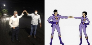 Em Barbosa Ferraz a visitinha incluiu uma vistoria em obras de asfalto de R$ 2,5 milhões. Já era de noite. O cumprimento com o prefeito Edenilson Miliossi lembrou os Supergêmeos do desenho animado Super Amigos. Ah, em tempo de covid é assim...