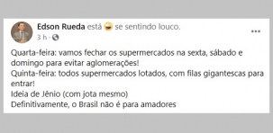 Edson Rueda Jr, juiz de direito, criticando, em postagem em redes sociais, a decisão da prefeitura de Campo Mourão de fechar supermercados nos três dias do feriadão - sexta, sábado e domingo -, o que gerou grandes filas nesta quinta-feira.