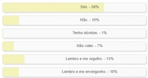"Você lembra em quem votou para deputado na última eleição?" Enquete com essa pergunta foi encerrada neste domingo. A maioria (58%) respondeu que lembra sim do voto. E ainda teve 13% que não só lembra como se orgulha desse voto. Já 10% não se lembra e outros 10% se lembra, mas se envergonha disso. O resultado completo está no quadro acima.