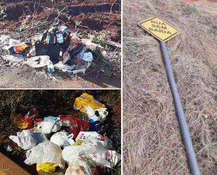 "Cenas do Residencial Parque do Lago. Garrafas jogadas em terrenos baldios, placas de sinalizações arrancadas e muito mais, infelizmente".