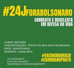Tem manifestações agendadas para este sábado contra o presidente Jair Bolsonaro. Em Campo Mourao foi marcada uma carreata (9h30) com saída na "Rua das Palmeiras" (perto do rodoviária). À frente estão movimentos sociais, sindicatos e partidos de esquerda. "Pedindo o fim de um governo que condena inúmeras famílias ao desemprego e à pobreza, que condenou milhares de vidas à morte fazendo pouco caso das vacinas", frisa postagem do PT mourãoense em redes sociais.