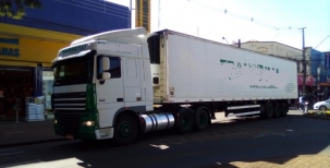 Carreta passa pela av. Capitão Índio Bandeira, trecho do calçadão, no centro de Campo Mourão. Foi nesta sexta-feira à tarde. (QI TV)