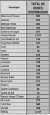 A 11.a Regional de Saúde distribui nesta segunda-feira mais 6.747 doses de vacina contra a covid-19. Tem Astrazeneca, Janssen e Pfizer. Desse total, 1.577 ficam em Campo Mourão. O quadro acima mostra as doses em todos os 25 municípios da Comcam.