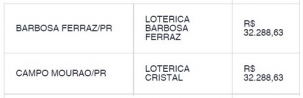 Um apostador de Colatina/ES acertou sozinho as seis unidades da Mega-Sena sorteadas no sábado. Ganhou R$ 76,2 milhões. Na região, dois apostadores "quase" viraram milionários. Uma aposta feita em Campo Mourão e outra em Barbosa Ferraz acertaram cinco dos seis números sorteados. Levaram prêmio R$ 32,2 mil cada um. Ao todo, 192 apostas fizeram a quina.