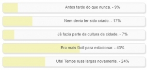 "O que você achou do fim do estacionamento em diagonal no centro de Campo Mourão?" Enquete com essa pergunta foi encerrada neste domingo. Venceu a alternativa "Era mais fácil estacionar", com 43% dos votos. "Ufa! Temos ruas largas novamente" ficou em segundo, com 24%. "Nem devia ter sido criado" teve 17% da preferência. O resultado completo está no quadro acima.