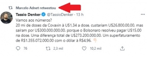 O mourãoense Tássio Denker, que trabalha no Ministério Público de Campo Mourão, fez postagem no Twitter sobre o valor pago pelo governo federal pelas doses da vacina Covaxin. Olha só quem "retuitou", o humorista Marcelo Adnet, que tem 3,4 milhões de seguidores nessa rede social.