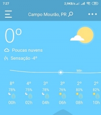 Internauta manda print do site Climatempo. Feito às 7h27, mostra Campo Mourão com 0 grau e sensação de -4. No "Bom Dia Paraná" (RPC) Campo Mourão apareceu com -0.4 grau às 7h49. A previsão para esta terça-feira é de temperatura máxima de 14 gras. Para quarta-feira, o Climatempo prevê a mínima de -1 e a máxima de 16 graus.