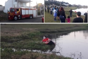 "Acionaram Siate e Corpo de Bombeiros, neste domingo à tarde, para resgatar um cachorro que estava preso nas algas na beira do lago do Parque do Lago, em Campo Mourão.