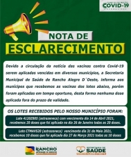A prefeitura de Rancho Alegre do Oeste se manifestou sobre aquela história de vacina contra covid-19 com validade vencida. Disse que recebeu 30 doses dos dois lotes citados, mas que todas foram aplicadas bem antes do vencimento. Vinte que venceriam em 14 de abril foram usadas em 26 de janeiro. Outras 10 que iriam vencer em 31 de maio foram aplicadas em 27 de março.