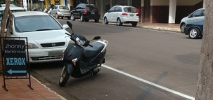 Apesar da sinalização, motos continuam usando vagas de carros no cntro de Campo Mourão. Essa foi na rua Brasil, bem pertinho da prefeitura.