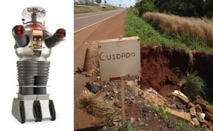 A rodovia é a BR-487, em Campo Mourão, saída para Guarapuava. O buraco às margens segue avançando e o Robô alerta para o perígo, principallemnte para ciclistas que andam à noite pelo trecho.