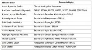 A prefeitura de Campo Mourão publicou nesta sexta-feira a relação dos servidores eleitos na eleição do "Servidor do Ano". São 11 funcionários de setores diferentes, inclusive a Câmara de Vereadores (veja a relação acima). A eleição é direta, ou seja, sao os próprios colegas que votam, Tudo para marcar o Dia do Servidor, em 28 de outubro.