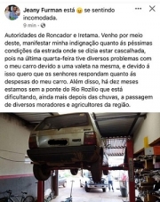 Moradora de Roncador, Jeany Furman usou as redes sociais para mostrar o carro dela estaleirado em oficina mecânica. Disse que o veículo teve problemas por causa de uma valeta na estrada entre Roncador e Iretama. "Devido a isso, quero que os senhores respondam quanto às despesas do meu carro", frisou a contribuinte. Por "senhores" entenda-se as autoridades dos dois municípios. Ai-aiai-aiai!...