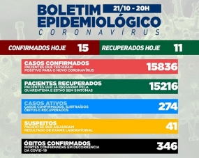 Campo Mourão teve 15 casos de covid-19 confirmados nesta quinta-feira. Os recuperados foram 11. Os moradores com o vírus ativo são 274. Na ala covid são sete internações, sendo três na unidade de terapia intensiva. A taxa de ocupação de leitos ficou em 12% na UTI e 10% na enfermaria. Há apenas um morador de Campo Mourão na UTI.