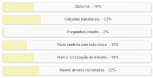 "O que você gostaria de ver em um ano, quando Campo Mourão completar 75 anos?" Enquete encerrada neste domingo deu vitória à alternativa "Calçadas transitáveis", com 23% votos. Em segundo, coladinho, ficou "Menos árvore derrubadas", com 22%. "Ciclovias!" e "Melhor sinalização de trânsito" empataram em terceiro, com 19% cada. O resultado completo está no quadro acima.