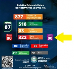 Altamira do Paraná está sem nenhum caso ativo de covid-19 no momento. O município registrou 322 casos desde o início da pandemia, com 311 recupeados e 11 mortes. Luiziana também voltou a ficar "zerada" (822 casos, 808 recuperações e 14 óbitos). O outro municicípio sem casos ativo é Rancho Alegre do Oeste, que está há mais de um mês sem moradores com covid-19.