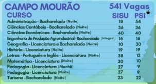 Começam nesta quarta-feira e seguem até 20 de outubro as inscrições para o "Vestibular 2022" da Unespar. São 3.072 vagas em 71 cursos oferecidos em seis cidades. Para o câmpus de Campo Mourão são 541 vagas em 10 cursos. A inscrição custa R$ 50, mas é possível pedir isenção. O ingresso se dará por notas do Enem ou médias finais de vestibulares da instituição. A Unespar tem sistema de cotas.