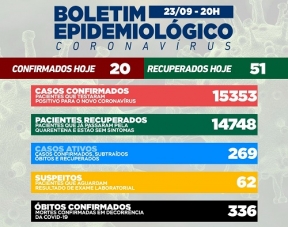 Vinte casos de covid-19 foram confirmados nesta quinta-feira em Campo Mourão. Os recuperados foram 51 e o número de moradores com o vírus ativo caiu para 269. A taxa de ocupação de leitos ficou em 73% na enfermaria e 50% na UTI SUS. São 12 pacientes na unidade de terapia intensiva, sendo seis de Campo Mourão.