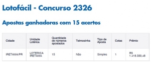 Uma aposta feita em Iretama foi a única em todo País que cravou os 15 números da Lotofácil sorteada no fim de semana. O iretamense sortudo garantiu um prêmio de R$ 1,4 milhão. A aposta simples foi feita na lotérica Iretama. Quem acertou 14 números fica com R$ 1,6 mil. Foram 185 apostadores em todo o Brasil, 14 deles no Paraná.