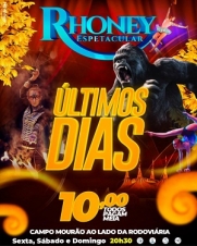O circo Rhoney Espetacular apresentará espetáculos neste fim de semana em Campo Mourão. Sexta, sábado e domingo, às 20h30, com preço único de R$ 10. O circo ficará na cidade até o próximo dia 12. As últimas apresentações visam arrecadar recursos para "seguir viagem". O Rhoney Espetacular está em Campo Mourão desde o início da pandemia e passou a maior parte do tempo sem poder se apresentar.