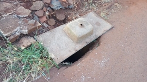 Tampão de pia é usada para tampar bueiro aberto numa esquina da rua Dr Carlos Boenig, no jardim Albuquerque, em Campo Mourão.