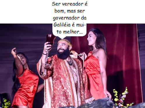 O clic é da Paixão de Cristo encernada na Fraternidade O Caminho, em Campo Mourão. O vereador Professor Cícero participou fazendo o papel de Herodes. Olha ele aí, curtindo a boa vida de governador da Galileia. Viu só, na Câmara malemá tem umas diariazinhas e o povo ainda fala...