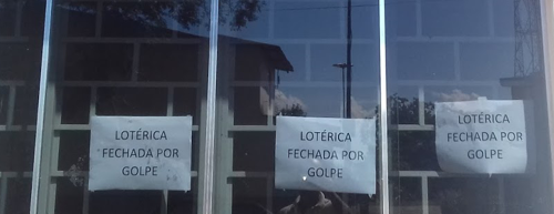 Repare o que dizem os cartazes colados na porta da única lotérica de Altamira do Paraná: "Lotérica fechada por golpe". Isso mesmo. O estabelecimento foi vítima de golpe e fechou as portas.