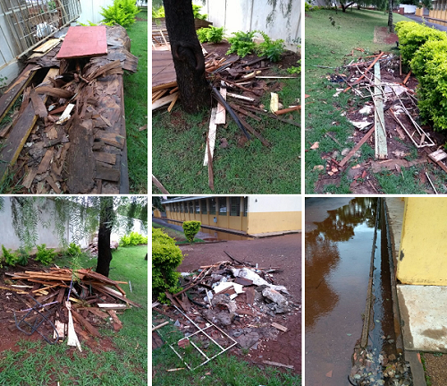 "Aqui na escola Cidade Nova faz um ano que estamos esperando a limpeza da obra paralisada. Já mandamos ofícios para as secretarias de Obras e de Educação e aulas iniciaram com o pátio assim. Será que estão esperando um escorpião ou o mosquito da dengue picar uma criança com essa sujeira toda?"