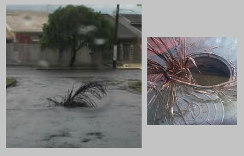 Numa rua ao lado do ginásio JK o bueiro no meio da rua apareceu aberto e "sinalizado" com galhos. Mais de perto,no entanto, percebe-se que a tampa de ferro está ao lado.