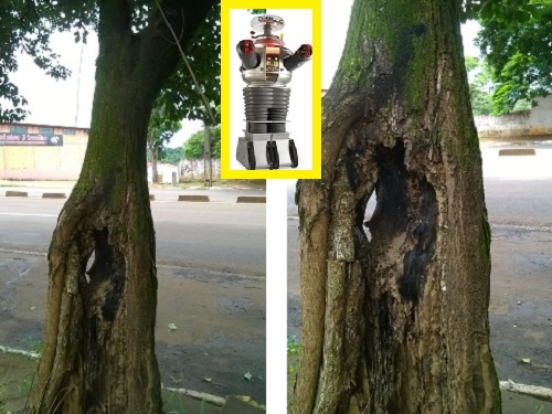"Perimetral Tancredo Neves, quase esquina com Santa Cruz. Árvore com risco de queda. Nota-se a flagrante condição de perigo".
