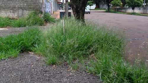 Calçada com mato na rua São Josafat, centro da cidade. Do outro lado da rua é o portão de entrada do câmpus da Unespar.