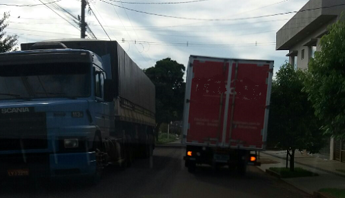 De um lado da rua, uma carreta estacionada. Do outro, um caminhão parado para fazer entrega. Quem precisou passar teve de manobrar e retornar. Cena deste sábado, numa rua próximo à Associação dos Agrônomos.