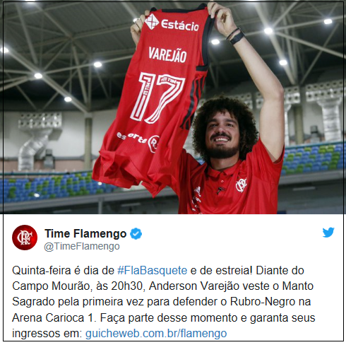 O pivô Anderson Varejão, de 35 anos, vai estrear no Flamengo nesta quinta-feira (20h30), em jogo contra Campo Mourão, no Rio de Janeiro. O anúncio foi feito pelo clube carioca no Twitter. Varejão vem de 14 temporadas na NBA, com passagens por Cleveland Cavaliers, Golden State Warriors e Toronto Raptors, Também jogou duas temporadas pelo Barcelona, da Espanha.