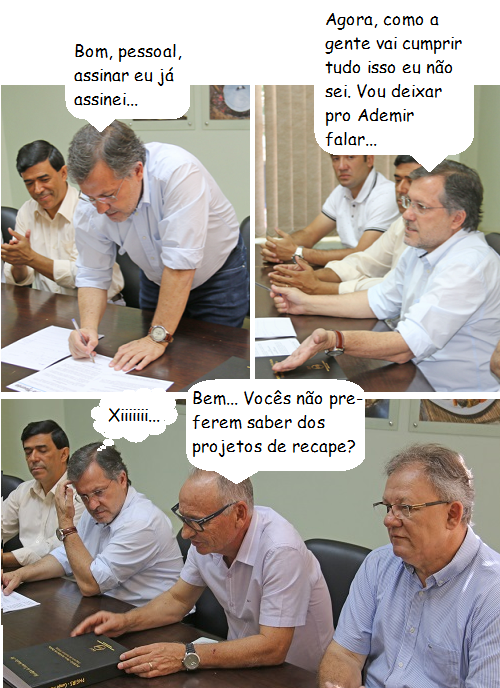 Teve solenidade na prefeitura, nesta quinta-feira, para o prefeito Tauillo Tezelli sancionar a Lei do Plano Municipal de Gestão Integrada de Resíduos Sólidos. Os vereadores Edson Battilani e Sidnei Jardim participaram, assim como o secretário Ademir Moro Ribas (Agricultura e Meio Ambiente), entre outras liderança. Agora, cá pra nós: é impressão ou tava todo mundo meio desanimado?...