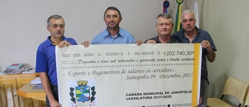 Janiópolis - Olha aí o prefeito Ismael Dezanoski, de Janiópolis, recebendo o "checão" das sobras da Câmara. São R$ 202 mil que serão utilizados para ajudar a pagar o salário de dezembro dos servidores e ainda resta uma parte para investir no esporte.